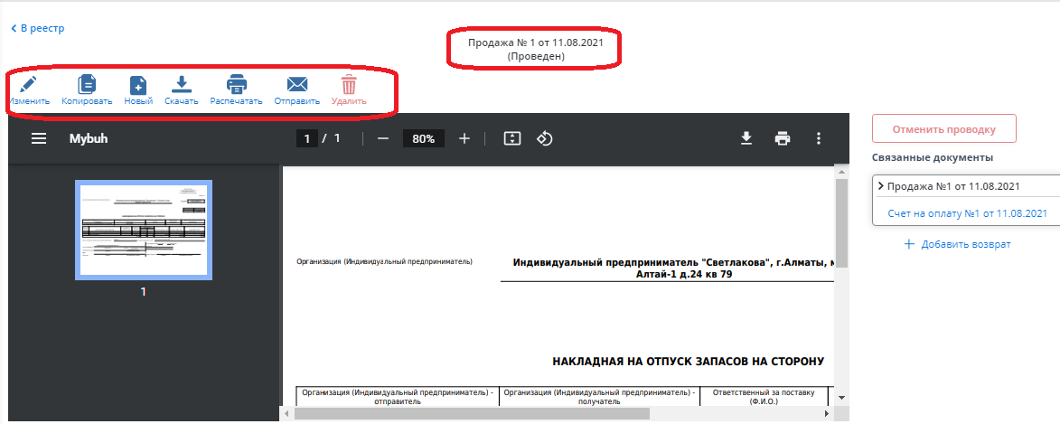 Нажатием на стрелку «В реестр» вы вернетесь в реестр накладных на