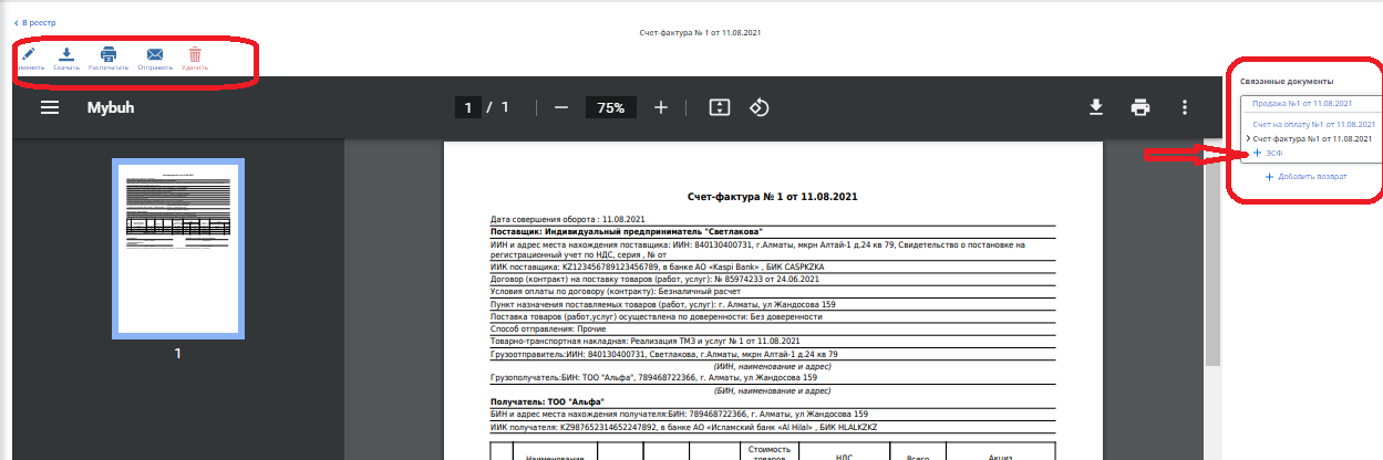 документов. Там же можно сформировать СФ и ЭСФ к накладной.