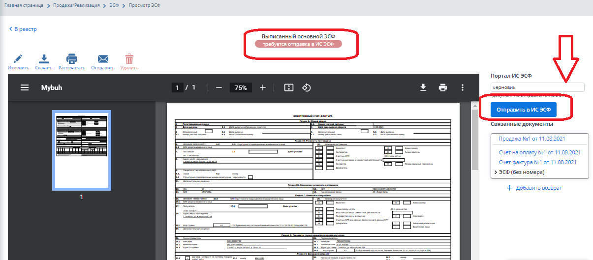 Для того, чтобы отправить ЭСФ с сервиса «Mybuh.kz» напрямую на портал ИС ЭСФ необходимо: