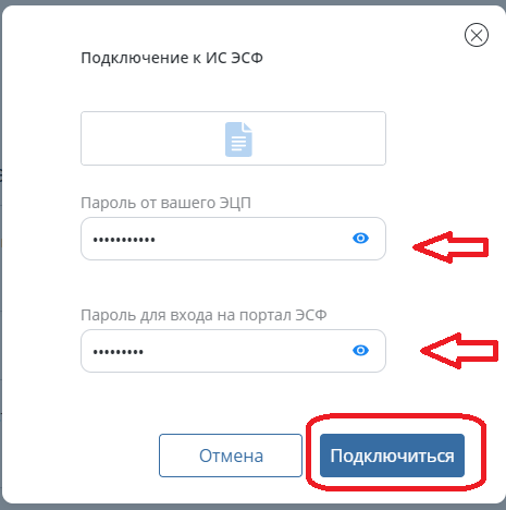 Если вы ранее уже были зарегистрированы на портале ИС ЭСФ, необходимо выбрать ключ ЭЦП для авторизации, ввести необходимые пароли и подключиться к порталу с помощью кнопки «Подключиться».
