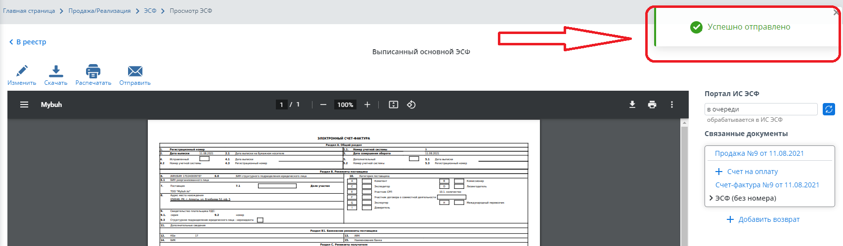 После подключения следует нажать на кнопку «Отправить», подписать отправку ЭЦП, после чего система выдаст уведомление о том, что ЭСФ успешно отправлена в ИС ЭСФ.