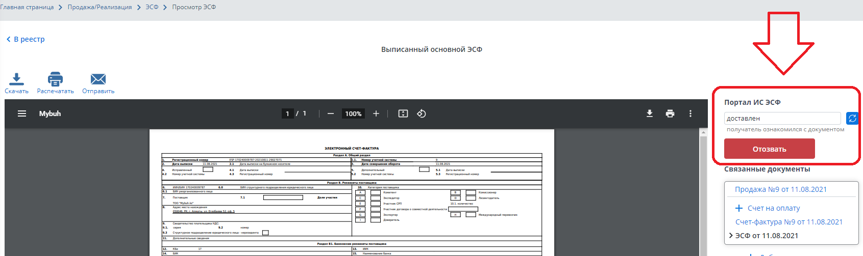 Статус вашего ЭСФ можно увидеть справа от печатной формы (черновик, доставлен и т.д.). Статус можно обновить нажав на синий значок обновления. После того, как ЭСФ будет успешно принят сервером ИС ЭСФ ему будет присвоен уникальный регистрационный номер. В случае ошибки Вы также можете отозвать ЭСФ воспользовавшись соответствующей кнопкой «Отозвать»